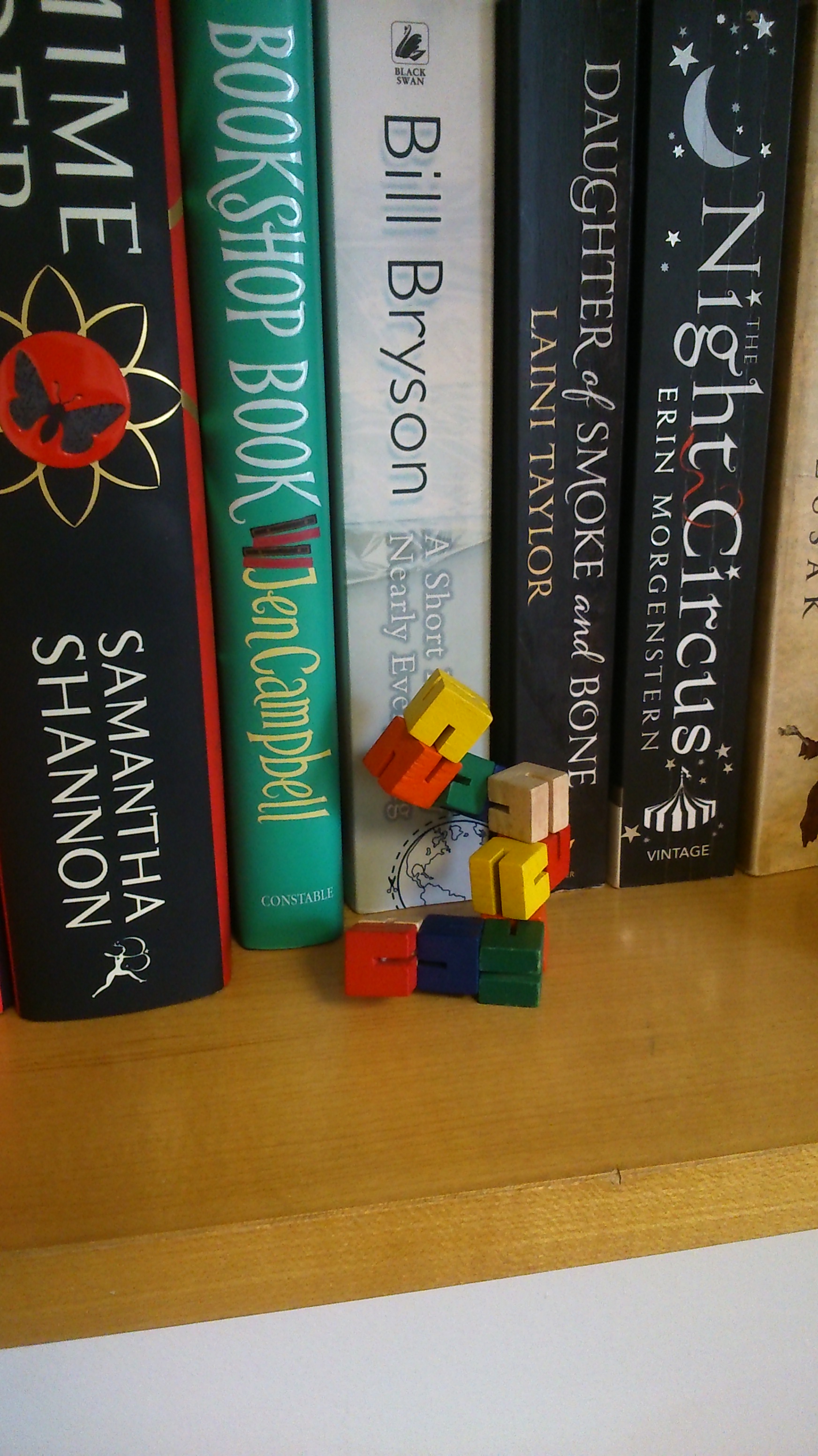 I got this thing in the Camera Obscura gift shop in Edinburgh. The blocks are strung through a piece of (I assume) elastic so you can move them slightly. Occasionally have fun twisting the blocks into different shapes and arrangements. Mostly it’s novelty, mostly I wanted a knick knack to remind me of my trip to Edinburgh with my friends so this works. And I’m a sucker for anything essentially pointless but colourful.