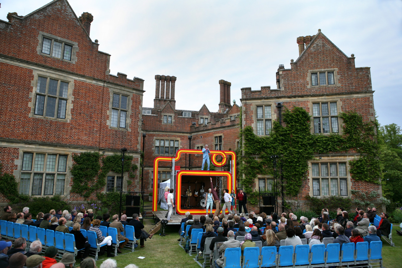 First and foremost I must mention the staging of this play – this is a production that truly comes into its own when it’s performed, as I saw it, outdoors. In Oxford it was staged in the quad of the Bodleian library, meaning the sound of the electric guitars and drums and chimes sounded out loud against the distant sound of passing buses and cars and the occasional person walking by in the street outside. As the interval ended and the second half of the play resumed, the darkening evening sky helped to mirror the darker tone the once-playful comedy’s plot had taken by this point. The sense of atmosphere this adds cannot be overstated – and having various members of the ensemble cast begin scenes by standing amongst the audience really helps add to the sense of comedy and anarchy. Different levels are used cleverly in this production, with dual ladders either side of a raised platform, and one at the rear, helping to stage the dialogue between friends or rivals in an explicitly visual way. Kudos must also be given to every single member of the ensemble, from the youngest to the oldest member, who leaped and bounded across the stage and up those ladders without faltering a single line of dialogue.