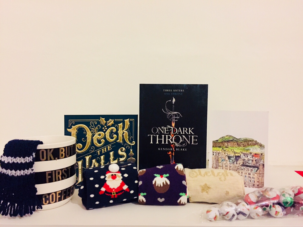Now to the box I received. My Santa was the lovely Jo/@iloveheartlandX who has outdone herself with my lovely gifts. I can’t thank her enough for being so thoughtful with the coffee mug (I do NEED coffee), Christmas-themed socks, Christmas chocolate balls, and more. I don’t know if she knew (or if she lives there?) but I love Edinburgh so the postcard of Arthur’s Seat was an extra unexpected surprise and the artwork on it is beautiful. She made sure to include a Christmas card too and I’m also SO looking forward to reading the book she chose from my wishlist: Kendare Blake’s One Dark Throne.